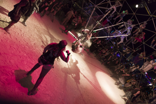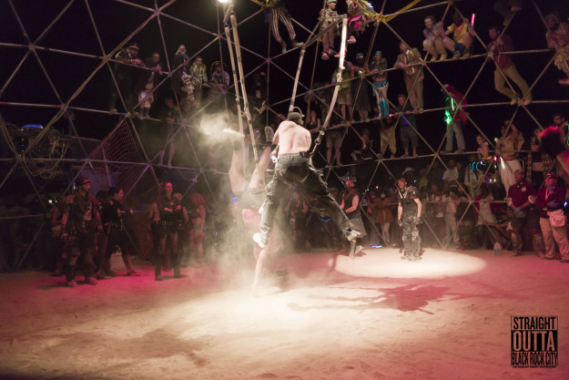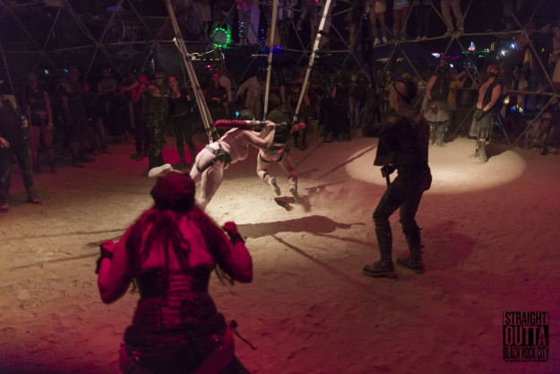 Auf dem Burning Man Event gibt es bestimmte Theme-Camps und eines davon ist das Camp von Death Guild. Death Guild ist der älteste operierende gothic/industrial dace club in den USA. Diese Mannschaft ist auch verantwortlich für den Death Guild Thunderdome auf dem Burning Man. Der Thunderdome ist ein sehr kurzweiliger Ort des Geschehens und besteht aus einem riesigen Metallkäfig auf den man klettern kann. So finden sich abends die Teilnehmer schon vor offiziellem Beginn am und auf dem Käfig ein, um am Spektakel teil zu nehmen. Das ganze erinnert ein wenig an Mad Max, denn die Zuschauer hängen auf dem Gerüst und Brüllen und feuern die Teilnehmer im Käfig an.